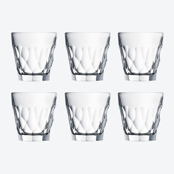 Gefertigt in Frankreichs ältester Glasmanufaktur nach einem Entwurf des Designers Benoit Convers, stehen sie für stilvolle Tischkultur. Robustes Maschinenglas, 9 cm hoch, 300 ml Inhalt, stapelbar, spülmaschinenfest.