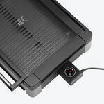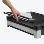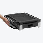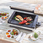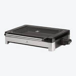 Korpus Edelstahl mit Kunststoff, 60 x 41 x 12 cm (B/T/H), Grillfläche 40 x 29 x 0,3 cm (B/T/H), 5-stufige Temperaturwahl, Fettauffangschale, wiegt 6,2 kg, rutschfest gummierte Füße, 230V/2.200 Watt, 1 m Kabel.