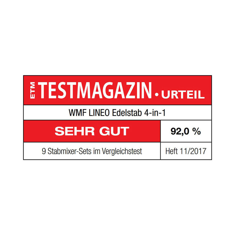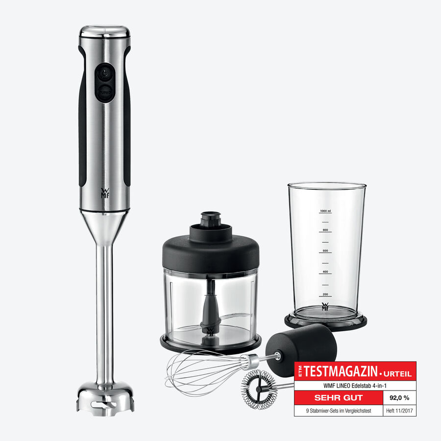 Korpus Edelstahl und Hartkunststoff, Ø 6 cm, 42 cm lang, wiegt 1,2 kg, ergonomischer Soft-Touch-Griff, umfangreiches Zubehör inklusive: 1 L-Mixbehälter und 600 ml-Zerkleinerer jeweils mit Antirutsch-Deckel, Schneebesenaufsatz, Milchschäumer-Aufsatz, 230V/700 W, stufenlos regelbare Geschwindigkeit bis 13.000 U/Min., 1 Minute-Dauerbetrieb, 1,4 m Anschlusskabel, geprüfte Sicherheit.