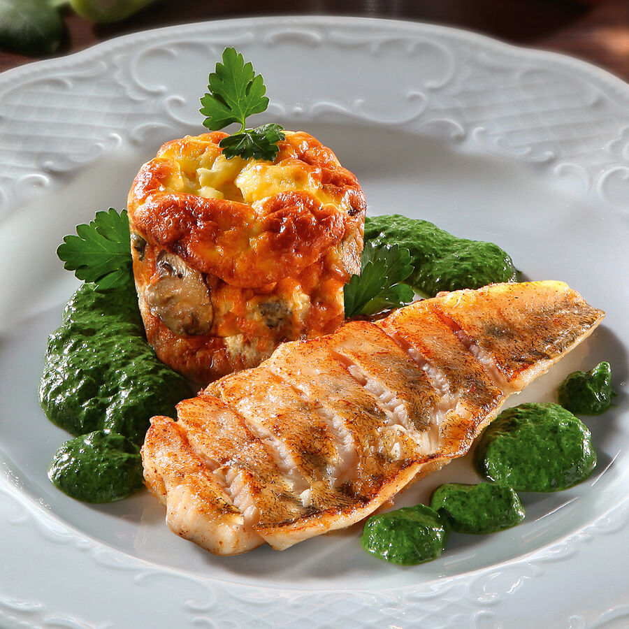 Die Spinatcreme auf vorgewärmte Teller geben. Pilz-Flans vorsichtig aus den Förmchen lösen und mit den gebratenen Zanderfilets auf der Spinatcreme anrichten.